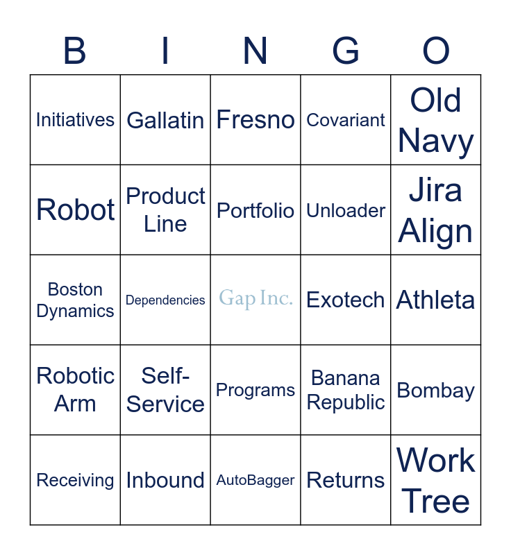 This bingo card has a free space and 28 words: Bombay, Unit Sorter, Unloader, Returns, Robot, Fresno, Gallatin, Robotic Arm, Exotech, Receiving, Boston Dynamics, Covariant, Inbound, AutoBagger, Jira Align, Capabilities, Self-Service, Product Line, Portfolio, Programs, Initiatives, Quarters, Work Tree, Dependencies, Athleta, Banana Republic, Old Navy and Aspirent.