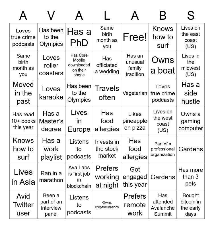 This bingo card has a free space and 66 words: Can speak 3 or more languages fluently, Knows how to surf, Has an unusual family tradition, Loves true crime podcasts, Likes pineapple on pizza, Loves roller coasters, Has been to the Olympics, Loves karaoke, Same birth month as you, Listens to podcasts, Travels often, Gardens, Moved in the past, Free!, Can speak 3 or more languages fluently, Knows how to surf, Has an unusual family tradition, Loves true crime podcasts, Likes pineapple on pizza, Loves roller coasters, Has been to the Olympics, Loves karaoke, Same birth month as you, Listens to podcasts, Travels often, Gardens, Has food allergies, Moved in the past year, Owns a boat, Ran in a marathon, Has a side hustle, Got engaged this year, Got married this year, Had a baby this year, Vegetarian, Has read 10+ books this year, Has more than 3 pets, Has officiated a wedding, Lives in Europe, Lives in Asia, Lives on the east coast (US), Lives on the west coast (US), Lives in the midwest (US), Can code, Owns cryptocurrency, Invests in the stock market, Has Core Mobile downloaded on their phone, Avid Twitter user, Bought bitcoin in the early days, Owns a gaming computer, Prefers remote work, Prefers working in office, Drinks 3+ cups coffee a day, Has worked at Ava Labs for 3+ years, Has worked here <1 year, Has a work playlist, Prefers working in the morning, Prefers working at night, Has a PhD, Has a Master’s degree, Part of a professional organization, Enjoys mentoring others, Has attended Avalanche Summit, Been a part of an interview panel, Ava Labs is first job in blockchain and Ava Labs is their first job.
