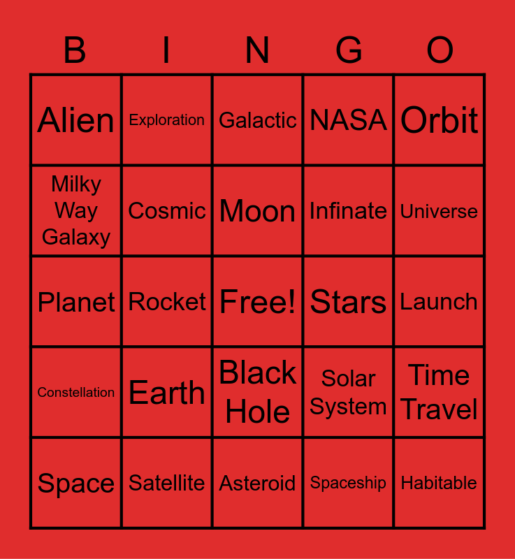 This bingo card has a free space and 24 words: Space, Earth, Moon, Spaceship, Orbit, Alien, Exploration, Galactic, Stars, Launch, Planet, Cosmic, Solar System, Time Travel, Milky Way Galaxy, Satellite, Asteroid, NASA, Universe, Constellation, Rocket, Black Hole, Infinate and Habitable.