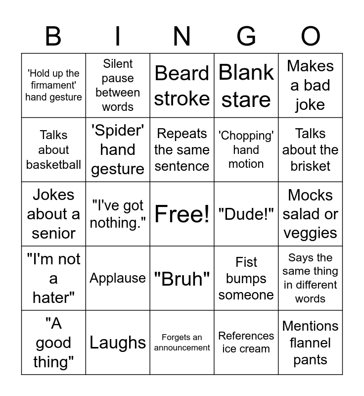 This bingo card has a free space and 24 words: Applause, Laughs, Repeats the same sentence, "A good thing", Makes a bad joke, 'Hold up the firmament' hand gesture, Talks about basketball, Silent pause between words, "Dude!", "Bruh", 'Chopping' hand motion, Jokes about a senior, Fist bumps someone, Says the same thing in different words, 'Spider' hand gesture, References ice cream, Mocks salad or veggies, Beard stroke, Talks about the brisket, "I've got nothing.", Mentions flannel pants, "I'm not a hater", Blank stare and Forgets an announcement.