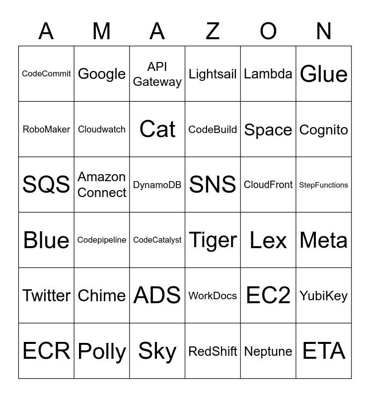 This bingo card has 37 words: EC2, WorkDocs, Neptune, RoboMaker, Codepipeline, CloudFront, Cloudwatch, RedShift, Lambda, ECR, Cognito, Lightsail, SQS, DynamoDB, Glue, SNS, Chime, API Gateway, StepFunctions, Amazon Connect, CodeCommit, CodeBuild, CodeCatalyst, Lex, Polly, Meta, Google, Sky, YubiKey, ADS, Prime, Tiger, Space, Twitter, Blue, Cat and ETA.