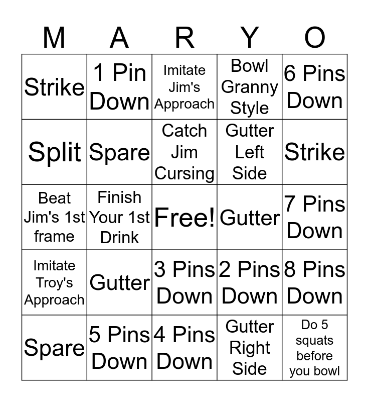 This bingo card has a free space and 24 words: Gutter, 5 Pins Down, Catch Jim Cursing, Spare, 6 Pins Down, Strike, Split, 1 Pin Down, Gutter, 3 Pins Down, Gutter Left Side, Beat Jim's 1st frame, 2 Pins Down, 8 Pins Down, Spare, Gutter Right Side, 7 Pins Down, Imitate Jim's Approach, Strike, Finish Your 1st Drink, Do 5 squats before you bowl, Imitate Troy's Approach, Bowl Granny Style and 4 Pins Down.