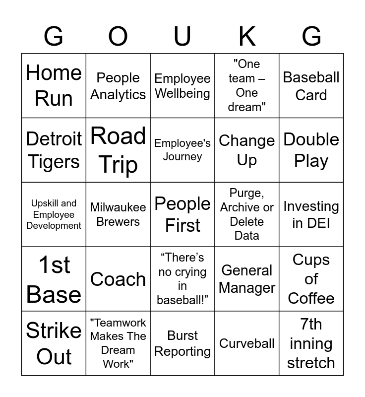 This bingo card has a free space and 29 words: Strike Out, Triple Play, Milwaukee Brewers, People are our Purpose, Home Run, Employee Wellbeing, Road Trip, Coach, Purge, Archive or Delete Data, "Teamwork Makes The Dream Work", Investing in DEI, 7th inning stretch, Burst Reporting, Curveball, Double Play, Pay insights, “There’s no crying in baseball!”, 1st Base, Baseball Card, Upskill and Employee Development, General Manager, “Don’t let the fear of striking out get in your way.“, Change Up, Detroit Tigers, "One team – One dream", People Analytics, Cups of Coffee, Employee's Journey and Retention Score.
