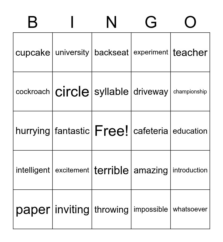This bingo card has a free space and 24 words: excitement, inviting, syllable, paper, teacher, cupcake, cockroach, university, cafeteria, terrible, driveway, hurrying, amazing, introduction, circle, impossible, education, backseat, championship, fantastic, whatsoever, intelligent, experiment and throwing.