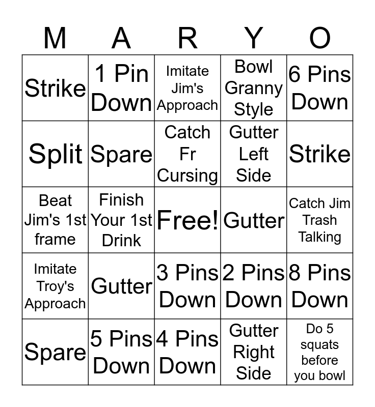 This bingo card has a free space and 24 words: Gutter, 5 Pins Down, Catch Fr Cursing, Spare, 6 Pins Down, Strike, Split, 1 Pin Down, Gutter, 3 Pins Down, Gutter Left Side, Beat Jim's 1st frame, 2 Pins Down, 8 Pins Down, Spare, Gutter Right Side, Catch Jim Trash Talking, Imitate Jim's Approach, Strike, Finish Your 1st Drink, Do 5 squats before you bowl, Imitate Troy's Approach, Bowl Granny Style and 4 Pins Down.