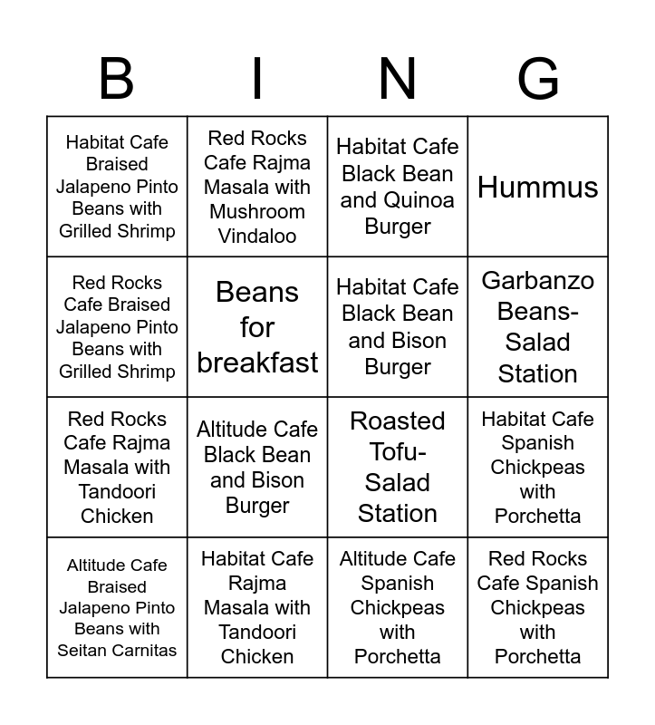 This bingo card has 31 words: Free!, Habitat Cafe White Bean and Cauliflower Fritter, Habitat Cafe Spanish Chickpeas with Porchetta, Habitat Cafe Braised Jalapeno Pinto Beans with Seitan Carnitas, Habitat Cafe Braised Jalapeno Pinto Beans with Grilled Shrimp, Habitat Cafe Black Bean and Quinoa Burger, Habitat Cafe Black Bean and Bison Burger, Habitat Cafe Rajma Masala with Mushroom Vindaloo, Habitat Cafe Rajma Masala with Tandoori Chicken, Altitude Cafe White Bean and Cauliflower Fritter, Altitude Cafe Spanish Chickpeas with Porchetta, Altitude Cafe Braised Jalapeno Pinto Beans with Seitan Carnitas, Altitude Cafe Braised Jalapeno Pinto Beans with Grilled Shrimp, Altitude Cafe Black Bean and Quinoa Burger, Altitude Cafe Black Bean and Bison Burger, Altitude Cafe Rajma Masala with Mushroom Vindaloo, Altitude Cafe Rajma Masala with Tandoori Chicken, Red Rocks Cafe White Bean and Cauliflower Fritter, Red Rocks Cafe Spanish Chickpeas with Porchetta, Red Rocks Cafe Braised Jalapeno Pinto Beans with Seitan Carnitas, Red Rocks Cafe Braised Jalapeno Pinto Beans with Grilled Shrimp, Red Rocks Cafe Black Bean and Quinoa Burger, Red Rocks Cafe Black Bean and Bison Burger, Red Rocks Cafe Rajma Masala with Mushroom Vindaloo, Red Rocks Cafe Rajma Masala with Tandoori Chicken, Beans for breakfast, Hummus, Roasted Tofu- Salad Station, Edamame - Salad Station, Garbanzo Beans- Salad Station and Navy Beans- Salad Station.