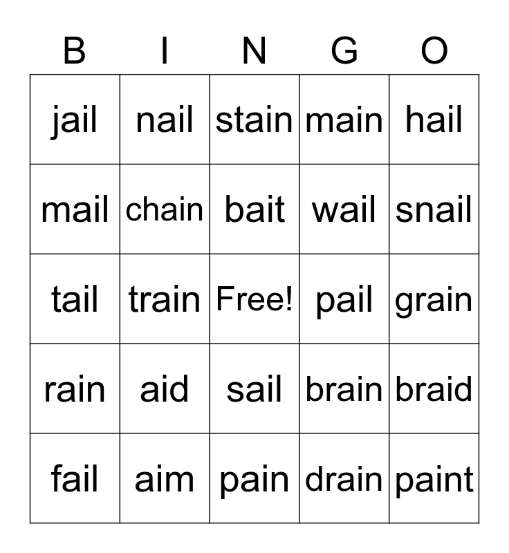 This bingo card has a free space and 24 words: aid, aim, bait, fail, hail, jail, mail, nail, pail, sail, wail, tail, brain, braid, chain, drain, grain, stain, snail, train, paint, rain, main and pain.