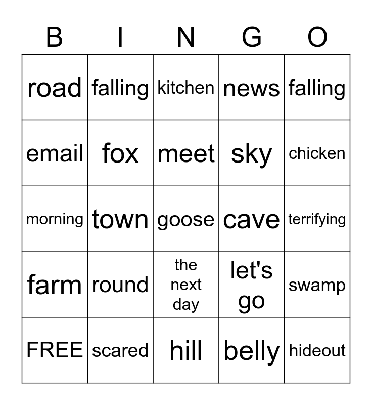 This bingo card has 27 words: let's go, hideout, sky, hill, email, kitchen, falling, farm, cave, swamp, morning, news, FREE, scared, chicken, warn, fox, meet, round, road, terrifying, belly, town, goose, the next day, falling and coffee shop.