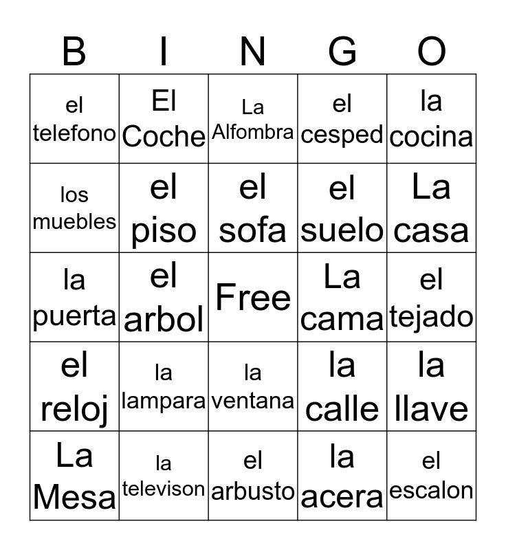 This bingo card has a free space and 24 words: la lampara, la televison, el sofa, La Mesa, la cocina, el telefono, los muebles, El Coche, La cama, la ventana, el suelo, la puerta, la calle, la llave, el piso, la acera, el tejado, La Alfombra, La casa, el arbol, el escalon, el reloj, el cesped and el arbusto.