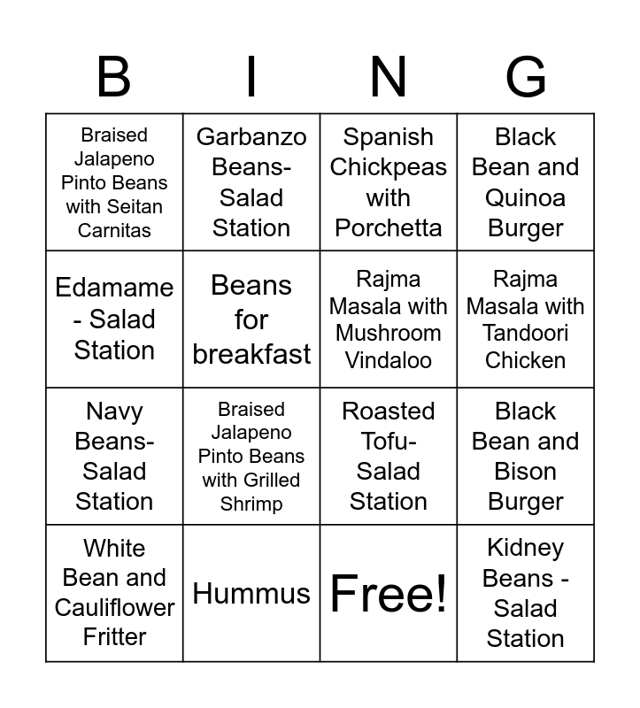 This bingo card has 17 words: Free!, White Bean and Cauliflower Fritter, Spanish Chickpeas with Porchetta, Braised Jalapeno Pinto Beans with Seitan Carnitas, Braised Jalapeno Pinto Beans with Grilled Shrimp, Black Bean and Quinoa Burger, Black Bean and Bison Burger, Rajma Masala with Mushroom Vindaloo, Rajma Masala with Tandoori Chicken, Beans for breakfast, Hummus, Roasted Tofu- Salad Station, Edamame - Salad Station, Garbanzo Beans- Salad Station, Navy Beans- Salad Station, Beans in a Soup and Kidney Beans - Salad Station.