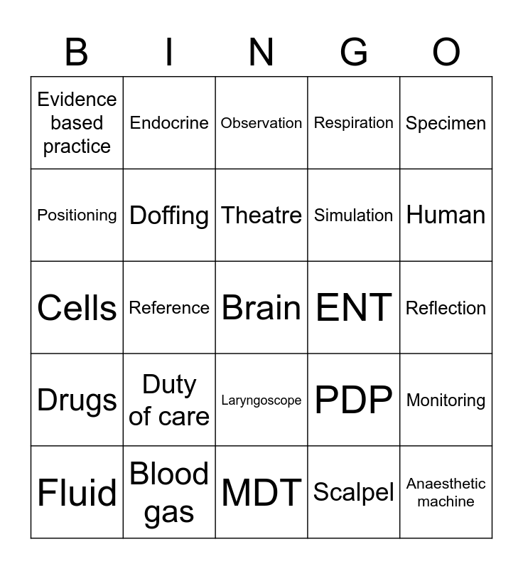 This bingo card has a free space and 44 words: Betadine, Anaesthetic machine, Nail brush, Fluid, Medicine, Scalpel, Observation, Advocacy, Specimen, Blood gas, Respiration, ENT, Laryngoscope, Duty of care, Suture, MDT, ET Tube, Cells, Anatomy, Human, Endocrine, Infection, Cannula, Evidence based practice, Sterle, Reflection, Vomiting, Patient, PDP, Drugs, Consent, Monitoring, Safeguarding, Surgery, Reference, LMA, Information, Antibiotic, Theatre, Positioning, Simulation, Blood glucose, Doffing and Mask.