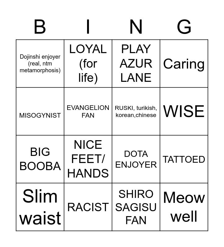 This bingo card has 16 words: RACIST, TATTOED, PLAY AZUR LANE, Dojinshi enjoyer (real, ntm metamorphosis), BIG BOOBA, LOYAL (for life), DOTA ENJOYER, SHIRO SAGISU FAN, MISOGYNIST, EVANGELION FAN, Slim waist, Caring, NICE FEET/ HANDS, WISE, RUSKI, turikish, korean,chinese and Meow well.