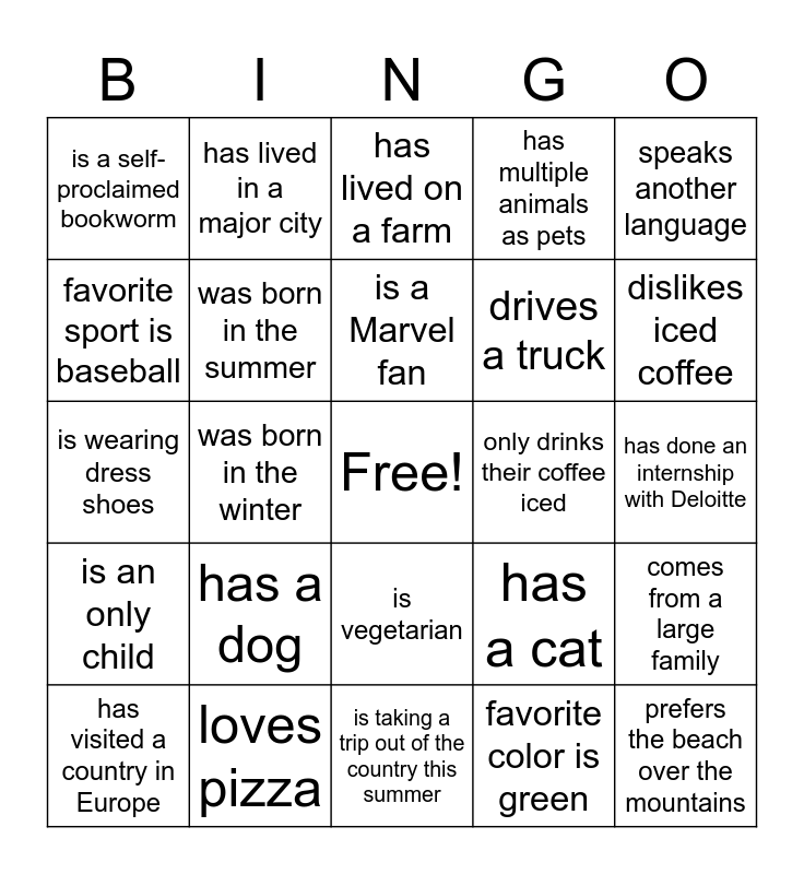 This bingo card has a free space and 24 words: has a dog, loves pizza, is a Marvel fan, has visited a country in Europe, speaks another language, is a self-proclaimed bookworm, favorite sport is baseball, has lived in a major city, only drinks their coffee iced, is vegetarian, drives a truck, is wearing dress shoes, has a cat, comes from a large family, was born in the summer, favorite color is green, has done an internship with Deloitte, has lived on a farm, dislikes iced coffee, was born in the winter, prefers the beach over the mountains, is an only child, has multiple animals as pets and is taking a trip out of the country this summer.