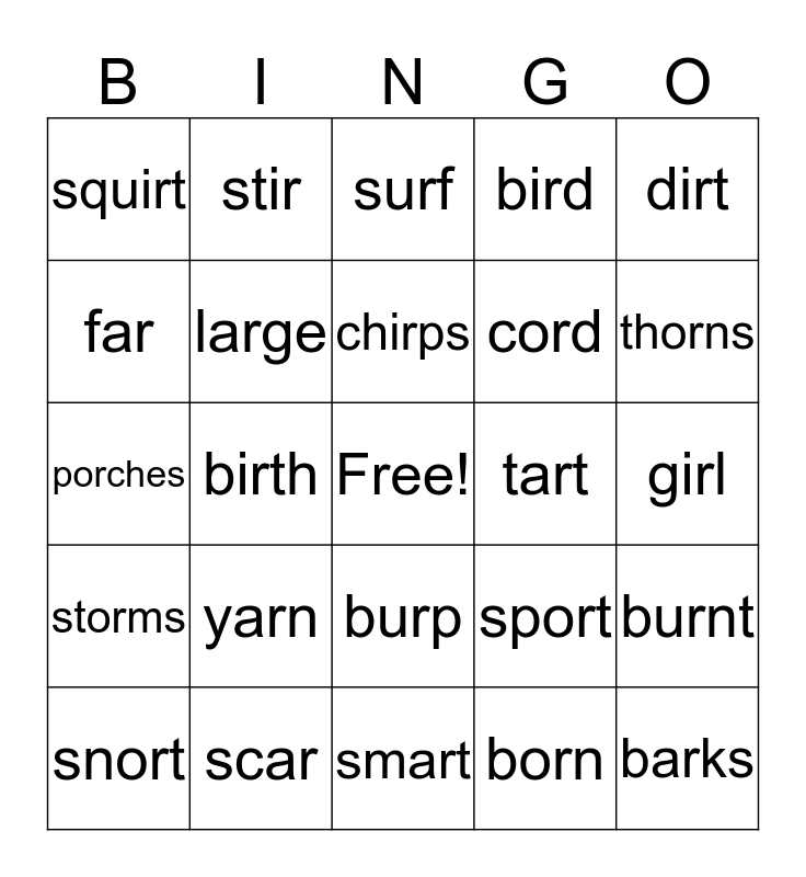 This bingo card has a free space and 30 words: scar, north, birth, tar, squirt, surf, large, burp, tart, smart, girl, barks, born, squirm, thorns, cars, sport, storms, yarn, dirt, porches, farm, stir, cord, far, bird, burnt, snort, chirps and girls.