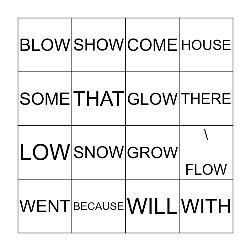 This bingo card has 16 words: BECAUSE, \ FLOW, COME, BLOW, LOW, SHOW, GROW, WILL, SOME, THAT, WENT, HOUSE, SNOW, THERE, GLOW and WITH.