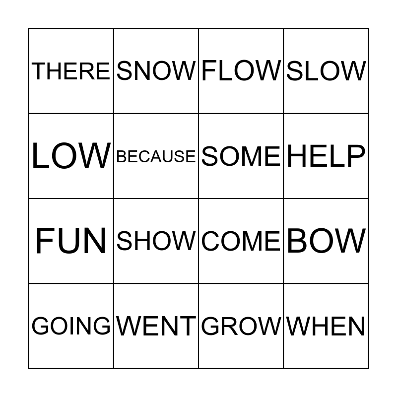 This bingo card has 16 words: WENT, BOW, FLOW, THERE, FUN, SNOW, COME, GROW, LOW, BECAUSE, GOING, SLOW, SHOW, HELP, SOME and WHEN.