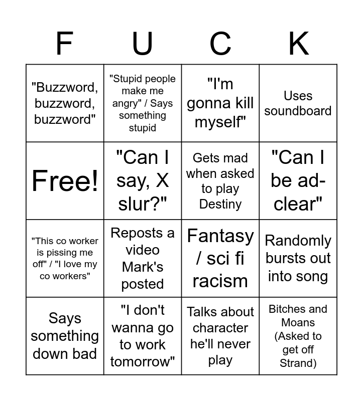 This bingo card has 16 words: "I don't wanna go to work tomorrow", Randomly bursts out into song, "I'm gonna kill myself", "Buzzword, buzzword, buzzword", "This co worker is pissing me off" / "I love my co workers", "Stupid people make me angry" / Says something stupid, Fantasy / sci fi racism, Talks about character he'll never play, Free!, "Can I say, X slur?", Says something down bad, Uses soundboard, Reposts a video Mark's posted, "Can I be ad-clear", Gets mad when asked to play Destiny and Bitches and Moans (Asked to get off Strand).