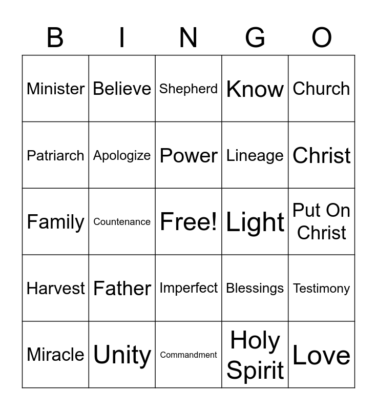 This bingo card has a free space and 29 words: Miracle, Forgiveness, Countenance, Mission, Minister, Shepherd, Apologize, Father, Light, Unity, Put On Christ, Love, Commandment, Holy Spirit, Christ, Pray, Imperfect, Harvest, Church, Family, Blessings, Personal, Lineage, Patriarch, Know, Believe, Testimony, Power and Bear.