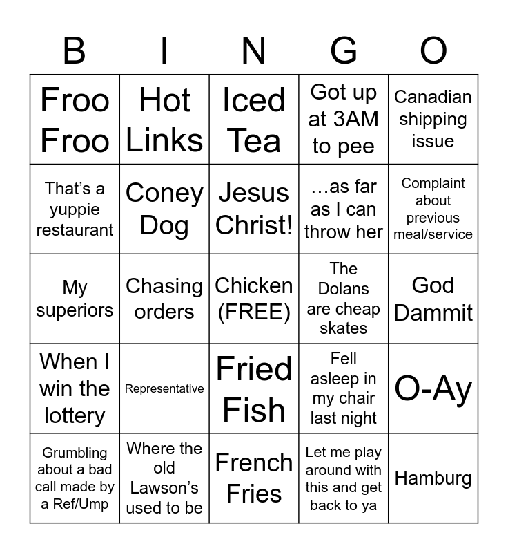 This bingo card has a free space and 24 words: Representative, Where the old Lawson’s used to be, Jesus Christ!, Grumbling about a bad call made by a Ref/Ump, Canadian shipping issue, Froo Froo, That’s a yuppie restaurant, Hot Links, The Dolans are cheap skates, Fried Fish, …as far as I can throw her, My superiors, Fell asleep in my chair last night, O-Ay, Coney Dog, Let me play around with this and get back to ya, God Dammit, Iced Tea, Complaint about previous meal/service, Chasing orders, Hamburg, When I win the lottery, Got up at 3AM to pee and French Fries.