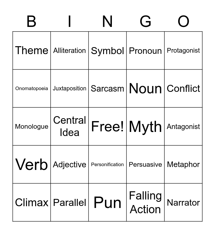 This bingo card has a free space and 63 words: Allusion, Anecdote, Oxymoron, Metaphor, Simile, Reflection, Alliteration, Irony, Sarcasm, Imagery, Personification, Hyperbole, Antagonist, Protagonist, Synonym, Onomatopoeia, Central Idea, Theme, Foreshadowing, Noun, Adjective, Verb, Pronoun, Point of View, Analogy, Objective, Inference, Evidence, Dialogue, Claim, Reasoning, Context Clues, Characters, Plot, Conflict, Climax, Rising Action, Falling Action, Compare and Contrast, Juxtaposition, Monologue, Myth, Fiction, Non-Fiction, Narrator, Parallel, Structure, Persuasive, Perspective, Prefix, Suffix, Pun, Resolution, Satire, Setting, Symbol, Thesis, Tone, Active Voice, Passive Voice, Analyze, Flashback and Rhetorical Question.