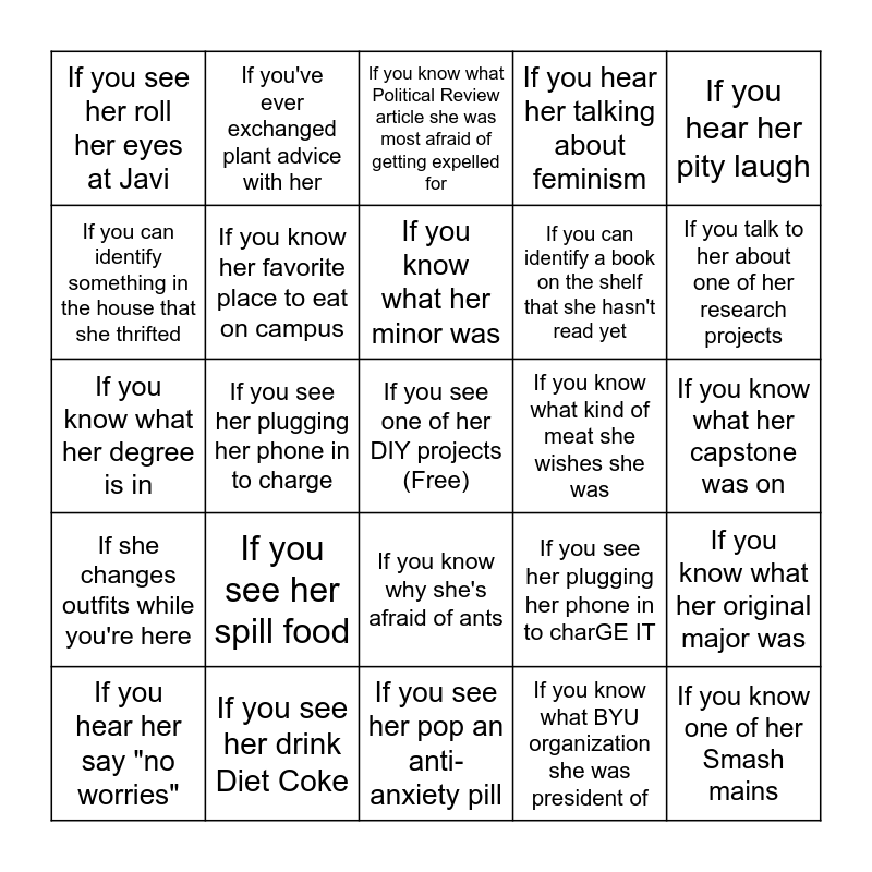 This bingo card has a free space and 24 words: If you see her spill food, If you see her drink Diet Coke, If you know what her minor was, If you hear her say "no worries", If you hear her pity laugh, If you see her roll her eyes at Javi, If you can identify something in the house that she thrifted, If you've ever exchanged plant advice with her, If you know what kind of meat she wishes she was, If you know why she's afraid of ants, If you can identify a book on the shelf that she hasn't read yet, If you know what her degree is in, If you see her plugging her phone in to charGE IT, If you know what her original major was, If you know her favorite place to eat on campus, If you know what BYU organization she was president of, If you know what her capstone was on, If you know what Political Review article she was most afraid of getting expelled for, If you talk to her about one of her research projects, If you see her plugging her phone in to charge, If you know one of her Smash mains, If she changes outfits while you're here, If you hear her talking about feminism and If you see her pop an anti-anxiety pill.