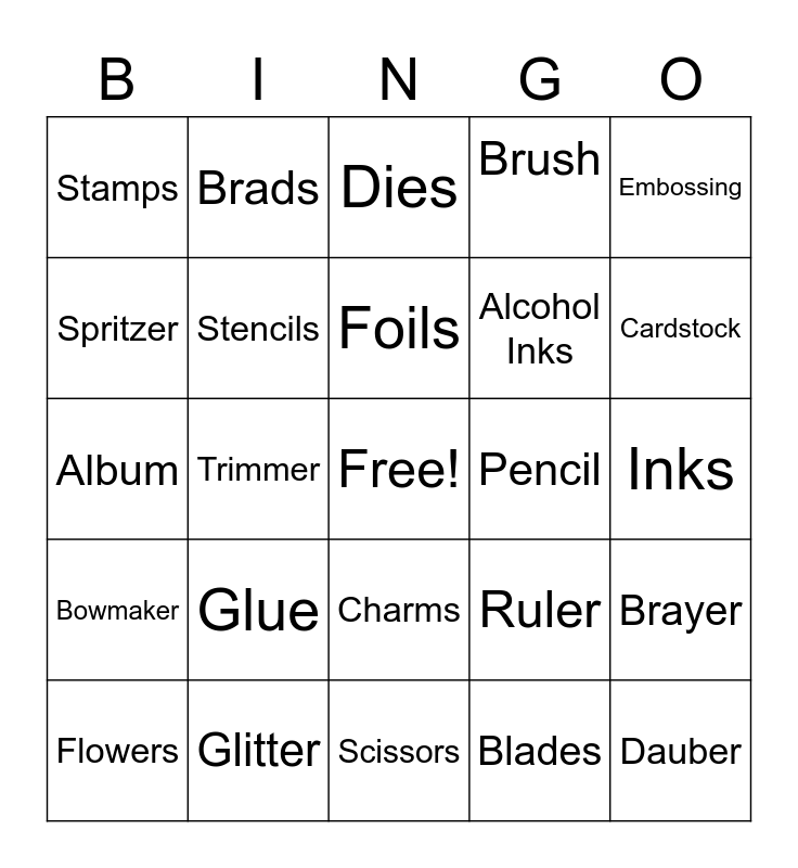 This bingo card has a free space and 31 words: Scissors, Tape, Trimmer, Paper, Stamps, Dies, Stencils, Ruler, Pencil, Blades, Inks, Dauber, Ribbon, Stickers, Cardstock, Knife, Brayer, Glue, Bowmaker, Charms, Embossing, Paint, Flowers, Brads, Alcohol Inks, Spritzer, Brush, Album, Glitter, Foils and stylus.
