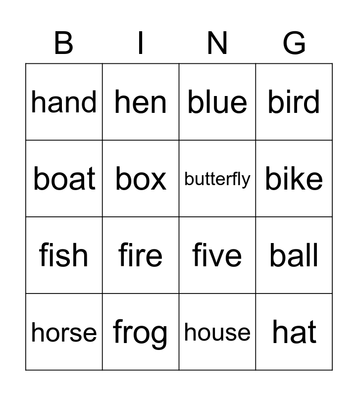 This bingo card has 16 words: frog, ball, blue, hand, fish, hen, five, house, boat, box, horse, bird, fire, bike, butterfly and hat.