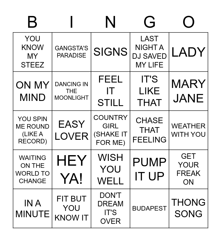 This bingo card has 60 words: SHOTS, FIT BUT YOU KNOW IT, DOPE, WAITING ON THE WORLD TO CHANGE, BUDAPEST, A THOUSAND MILES, DANCING IN THE MOONLIGHT, ONLY WANNA BE WITH YOU, IT'S LIKE THAT, HOW DEEP IS YOUR LOVE, LAST NIGHT A DJ SAVED MY LIFE, DANIELLE (SMILE ON MY FACE), ON MY MIND, CRACKER ISLAND, PUT IT ON, YOU KNOW MY STEEZ, COUNTRY GIRL (SHAKE IT FOR ME), LADY, UGLY, FEEL IT STILL, CHASE THAT FEELING, SIGNS, IN A MINUTE, GET YOUR FREAK ON, JENNY FROM THE BLOCK, WORK OUT, UP, ESSENCE, MARY JANE, I'M GONNA LOVE YOU JUST A LITTLE MORE BABY, KUNG FU FIGHTING, KISS FROM A ROSE, BIG BANK, LEARN TO FLY, GANGSTA'S PARADISE, HIGHER, LET'S GROOVE, EASY LOVER, SAY MY NAME, YOU SPIN ME ROUND (LIKE A RECORD), FAITH, HEY YA!, WEATHER WITH YOU, MR. BRIGHTSIDE, PUMP IT UP, BEL MERCY, KEEP YOUR HANDS OFF MY GIRL, BAD BLOOD, 10 OUT OF 10, WISH YOU WELL, DON'T DREAM IT'S OVER, FANCY, WHO CAN IT BE NOW?, SAY SO, TURN UP THE MUSIC, MOVES LIKE JAGGER, DIAMONDS, THANK U, NEXT, THONG SONG and BOYFRIEND.