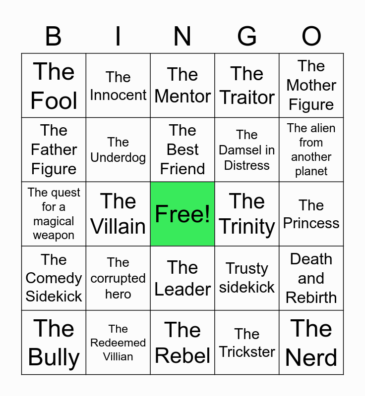 This bingo card has a free space and 24 words: The corrupted hero, The Redeemed Villian, The Best Friend, The Bully, The Mother Figure, The Fool, The Father Figure, The Innocent, The Trinity, The Leader, The Damsel in Distress, The quest for a magical weapon, Trusty sidekick, Death and Rebirth, The Underdog, The Trickster, The Princess, The Mentor, The alien from another planet, The Villain, The Nerd, The Comedy Sidekick, The Traitor and The Rebel.
