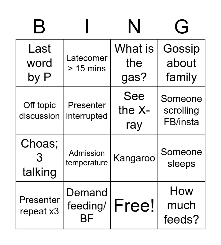 This bingo card has 17 words: Free!, Presenter repeat x3, What is the gas?, Last word by P, Admission temperature, Gossip about family, Someone sleeps, See the X-ray, Someone scrolling FB/insta, Presenter interrupted, Demand feeding/ BF, Kangaroo, Off topic discussion, Latecomer > 15 mins, Choas; 3 talking, Adjust lights and How much feeds?.