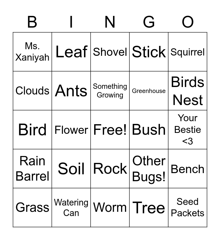 This bingo card has a free space and 24 words: Soil, Watering Can, Something Growing, Grass, Squirrel, Ms. Xaniyah, Clouds, Leaf, Bush, Rock, Greenhouse, Bird, Other Bugs!, Bench, Ants, Tree, Your Bestie <3, Shovel, Birds Nest, Flower, Seed Packets, Rain Barrel, Stick and Worm.