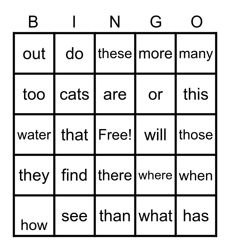This bingo card has a free space and 24 words: find, see, are, how, many, out, too, do, will, there, or, water, where, when, cats, what, those, these, this, that, has, they, more and than.
