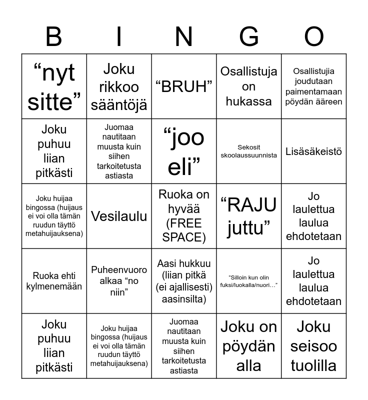 ⚠ This card has duplicate items: Puheenvuoro alkaa “no niin” (2), “joo eli” (2), Joku on pöydän alla (2), Jo laulettua laulua ehdotetaan (2), Ruoka ehti kylmenemään (2), Joku rikkoo sääntöjä (2), Aasi hukkuu (liian pitkä (ei ajallisesti) aasinsilta) (2), Sekosit skoolaussuunnista (2), Joku yrittää myydä vappulehteä (2), Joku puhuu liian pitkästi (2), Vesilaulu (2), “Silloin kun olin fuksi/luokalla/nuori…” (2), Joku seisoo tuolilla (2), Lisäsäkeistö (2), “...muuten hyvä talo mutta” (2), “BRUH” (2), “RAJU juttu” (2), Amogus (among us) (2), “nyt sitte” (2), Joku huijaa bingossa (huijaus ei voi olla tämän ruudun täyttö metahuijauksena) (2), Juomaa nautitaan muusta kuin siihen tarkoitetusta astiasta (2), Osallistuja on hukassa (2), Osallistujia joudutaan paimentamaan pöydän ääreen (2), Joku soittaa ääni- tai videopuhelun pöydästä (2)