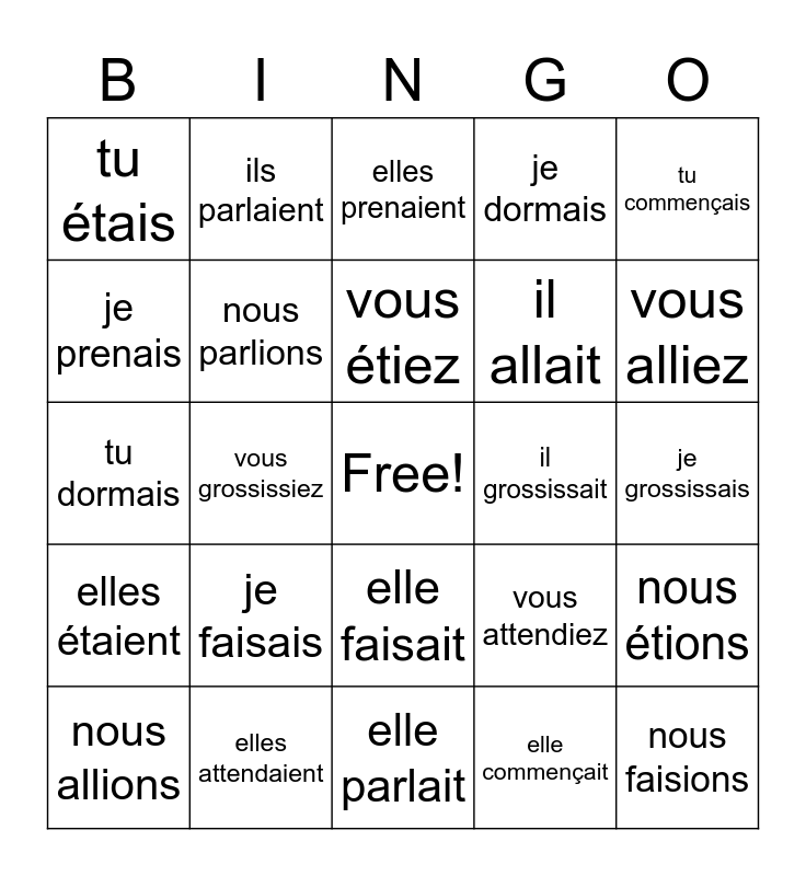 This bingo card has a free space and 24 words: je faisais, elles attendaient, vous étiez, nous allions, tu commençais, tu étais, je prenais, ils parlaient, il grossissait, elle faisait, il allait, tu dormais, vous attendiez, nous étions, nous parlions, elle commençait, je grossissais, elles prenaient, vous alliez, vous grossissiez, nous faisions, elles étaient, je dormais and elle parlait.