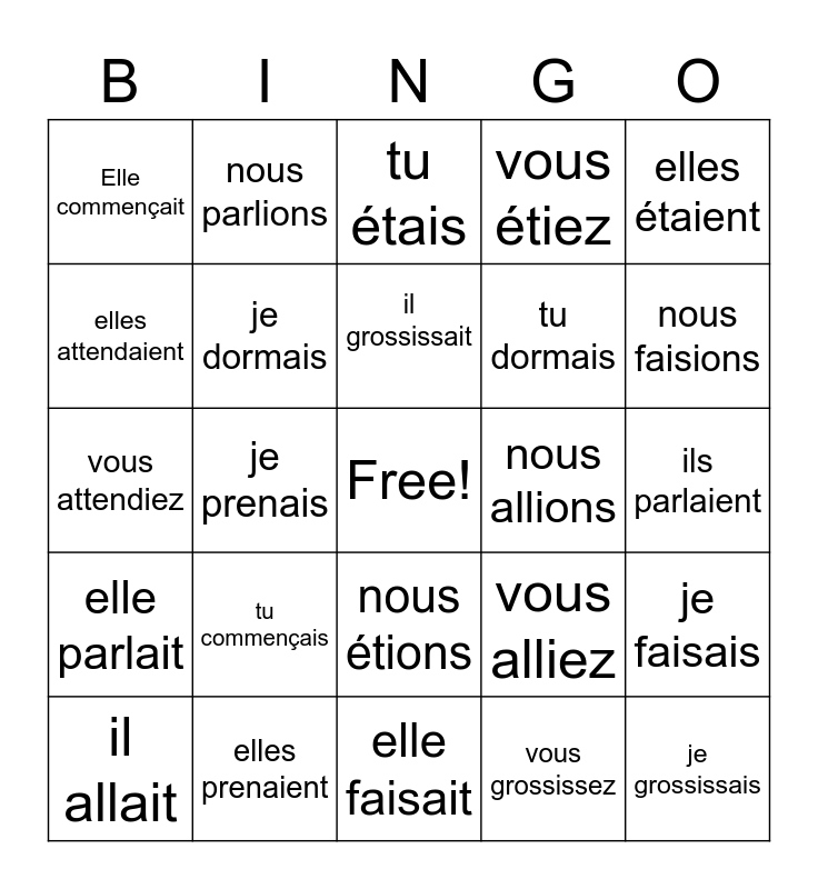 This bingo card has a free space and 24 words: tu commençais, elles prenaient, il grossissait, il allait, elles étaient, Elle commençait, elles attendaient, nous parlions, nous allions, nous étions, tu dormais, vous attendiez, vous alliez, je faisais, je dormais, vous grossissez, ils parlaient, tu étais, nous faisions, je prenais, je grossissais, elle parlait, vous étiez and elle faisait.