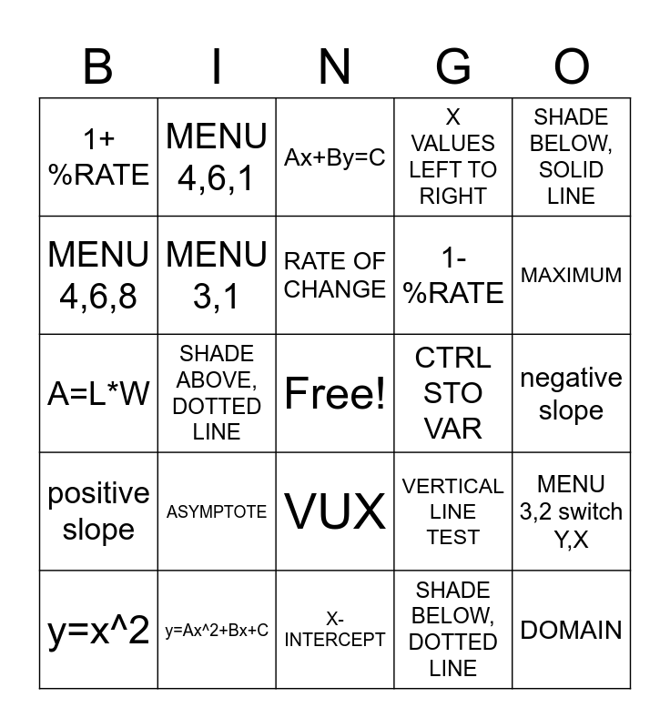 This bingo card has a free space and 52 words: RANGE, DOMAIN, Y-INTERCEPT, X-INTERCEPT, ASYMPTOTE, LIST & SPREADSHEET, MENU 4,6,1, MENU 4,6,4, MENU 4,6,8, MENU 3,3,1, MENU 3,1, MENU 3,2, MENU 3,2 switch Y,X, VERTICAL LINE TEST, FUNCTION, SLOPE, RATE OF CHANGE, CTRL STO VAR, SHADE ABOVE, SOLID LINE, SHADE BELOW, SOLID LINE, SHADE ABOVE, DOTTED LINE, SHADE BELOW, DOTTED LINE, 1+ %RATE, 1-%RATE, FACTORS, ROOTS, VERTEX, MINIMUM, MAXIMUM, AXIS OF SYMMETRY, MENU 5,1, X VALUES LEFT TO RIGHT, Y VALUES HIGH TO LOW, ZEROS, ROOTS, X-INTERCEPT, y=mx+b, Ax+By=C, y=Ax^2+Bx+C, y=(x+a)(x+b), slope formula, same slope, diff y-int, opposite sign flipped slopes, negative slope, positive slope, HOY, VUX, MENU 6,2, MENU 6,3, A=L*W, add all sides, y=x, y=x^2 and y=b^x.