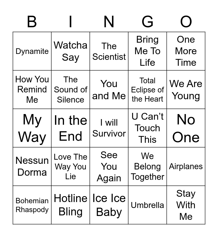 This bingo card has 55 words: Billie Jean, Bohemian Rhaspody, Jolene, Dynamite, Ice Ice Baby, Baby One More Time, The Sound of Silence, Hey Jude, Total Eclipse of the Heart, I Gotta Feeling, Bring Me To Life, Payphone, Blank Space, Gangnam Style, Welcome to My Life, Party in the USA, One More Time, In the End, Cry Me a River, I will Survivor, U Can’t Touch This, Since U Been Gone, We Belong Together, The Scientist, How To Save A Life, You and Me, Umbrella, Down, No One, Airplanes, Disturbia, Empire State of Mind, Yeah!, DJ Got Us Falling In Love, How You Remind Me, My Way, Death of a Bachelor, Nessun Dorma, Stay With Me, All of Me, Watcha Say, Sugar, We’re Going Down, Just The Way You Are, What Hurts The Most, Love The Way You Lie, Hotline Bling, Titanium, 7 years, Pump It, We Are Young, Barbie Girl, Super Bass, Say My Name, See You Again and I Want To Hold Your Hand.