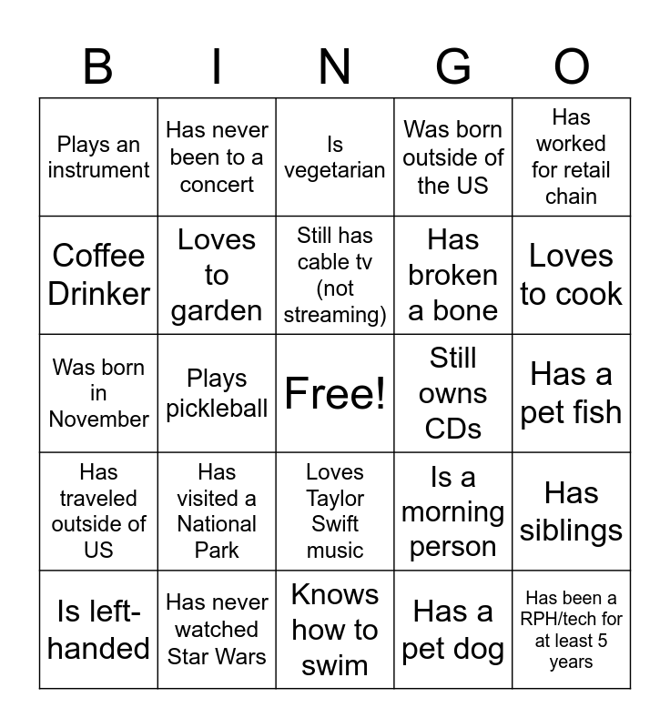This bingo card has a free space and 24 words: Has visited a National Park, Has never watched Star Wars, Still has cable tv (not streaming), Is left-handed, Has worked for retail chain, Plays an instrument, Coffee Drinker, Has never been to a concert, Still owns CDs, Loves Taylor Swift music, Has broken a bone, Was born in November, Is a morning person, Has siblings, Loves to garden, Has a pet dog, Has a pet fish, Is vegetarian, Loves to cook, Plays pickleball, Has been a RPH/tech for at least 5 years, Has traveled outside of US, Was born outside of the US and Knows how to swim.