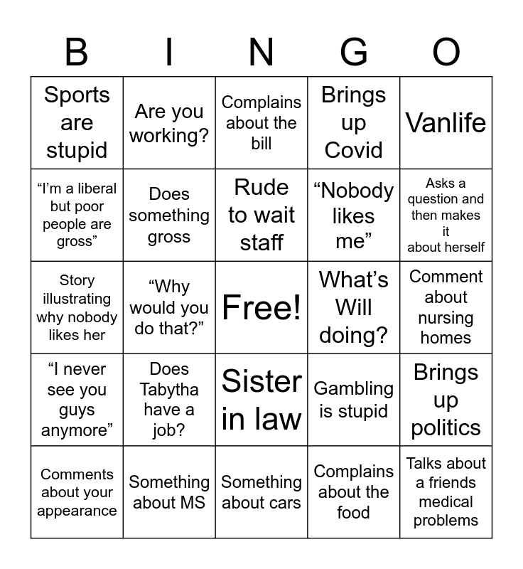 This bingo card has a free space and 24 words: Does Tabytha have a job?, Something about MS, Rude to wait staff, Comments about your appearance, Vanlife, Sports are stupid, “I’m a liberal but poor people are gross”, Are you working?, What’s Will doing?, Sister in law, “Nobody likes me”, Story illustrating why nobody likes her, Gambling is stupid, Brings up politics, Does something gross, Complains about the food, Comment about nursing homes, Complains about the bill, Asks a question and then makes it about herself, “Why would you do that?”, Talks about a friends medical problems, “I never see you guys anymore”, Brings up Covid and Something about cars.