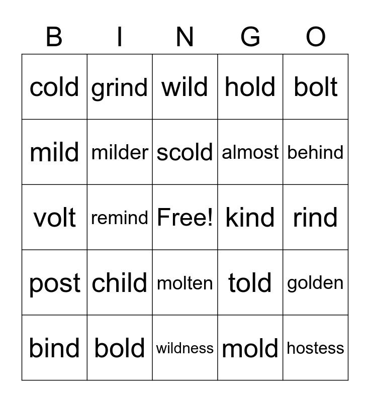 This bingo card has a free space and 24 words: child, bold, scold, bind, bolt, cold, mild, grind, kind, molten, almost, volt, told, golden, milder, mold, rind, wild, behind, remind, hostess, post, hold and wildness.