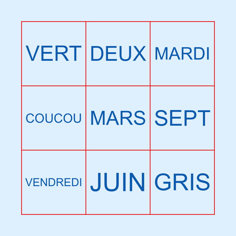 This bingo card has a free space and 8 words: SEPT, MARDI, DEUX, VENDREDI, VERT, GRIS, COUCOU and JUIN.