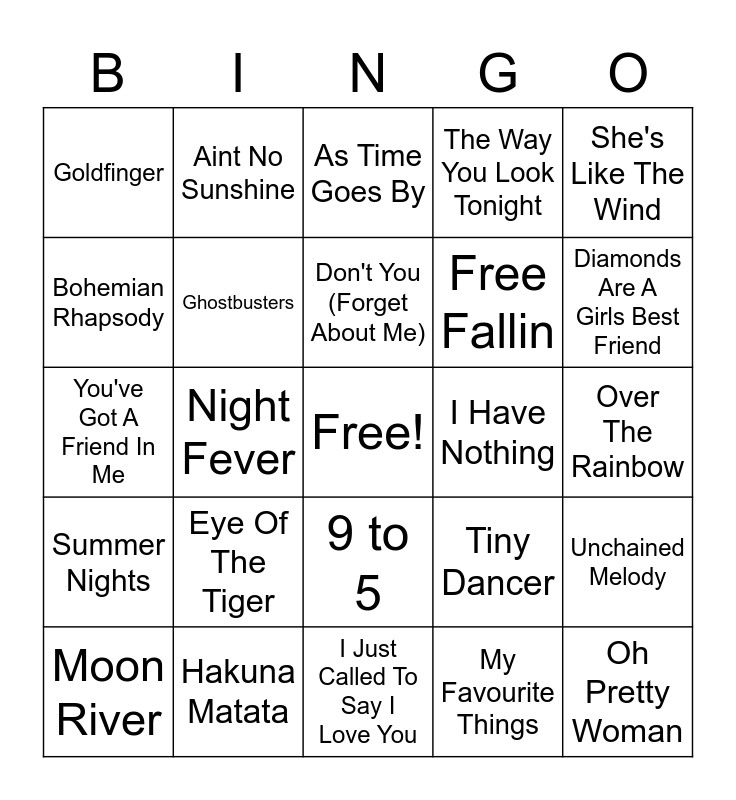 This bingo card has a free space and 24 words: Eye Of The Tiger, Hakuna Matata, Don't You (Forget About Me), Moon River, She's Like The Wind, Goldfinger, Bohemian Rhapsody, Aint No Sunshine, I Have Nothing, 9 to 5, Free Fallin, You've Got A Friend In Me, Tiny Dancer, Unchained Melody, Ghostbusters, My Favourite Things, Over The Rainbow, As Time Goes By, Diamonds Are A Girls Best Friend, Night Fever, Oh Pretty Woman, Summer Nights, The Way You Look Tonight and I Just Called To Say I Love You.