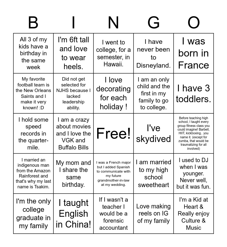 This bingo card has a free space and 49 words: I skipped second grade, I'm a Kid at Heart & Really enjoy Culture & Music, I had to evacuate from my country of birth because of a volcano eruption., If I wasn't a teacher I would be a forensic accountant, My mom and I share the same birthday., I have hiked to the bottom of the Grand Canyon 2 (soon to be 3) times!, I'm 6ft tall and love to wear heels., My daughter and her family (including my 2 granddaughters) live in Okinawa Japan (going to visit in May 2023 for the first time)!, My favorite football team is the New Orleans Saints and I make it very known! :D, I once asked out Shia Labeouf, Did not get selected for NJHS because I lacked leadership ability., I have never been to Disneyland., I used to DJ when I was younger. Never well, but it was fun., I am married to my high school sweetheart, I love Kpop and K-dramas and I am learning to speak, read, and write Korean., Played Division I college rugby., I love decorating for each holiday !, I've skydived, I am an amateur race car driver, I was born in France, I am a crazy about movies and I love the VGK and Buffalo Bills, Love making reels on IG of my family, All 3 of my kids have a birthday in the same week, I am an only child and the first in my family to go to college., I have a twin sister!, I have 3 toddlers., I'm the only college graduate in my family, I own my own Volvo 780 Semi., I was a French major but I added Spanish to communicate with my future grandmother-in-law at my wedding., I married an indigenous man from the Amazon Rainforest and that's why my last name is Tsakim., I can lose myself in a book for hours and hours and hours, I'm afraid of heights, yet I have been parasailing., Oldest of 6 siblings but the shortest of them all, I love technology., I taught English in China!, I played guitar for the number one Las Vegas Elvis Tribute show at the Las Vegas Hilton., I LOVE GIRAFFES!, I was in a Miss Teen Oklahoma pageant when I was 15., Before teaching high school, I taught every group fitness class you could imagine! Barbell, HIIT, kickboxing.. you name it. (except for zumba, that would be traumatizing for all involved), I originally majored in Architecture, and then Hospitality before switching to Education., I used to dissect fruit flies., I was born in Germany because my mom was in the military in the 70s!, I have traveled to over 35 countries!, I have a painting hang up in the airport, I hold some speed records in the quarter-mile., I went to college, for a semester, in Hawaii., I was once a marathon runner. Now I just run baby miles., I laugh a lot and I dog sit on the side! I love dogs!.