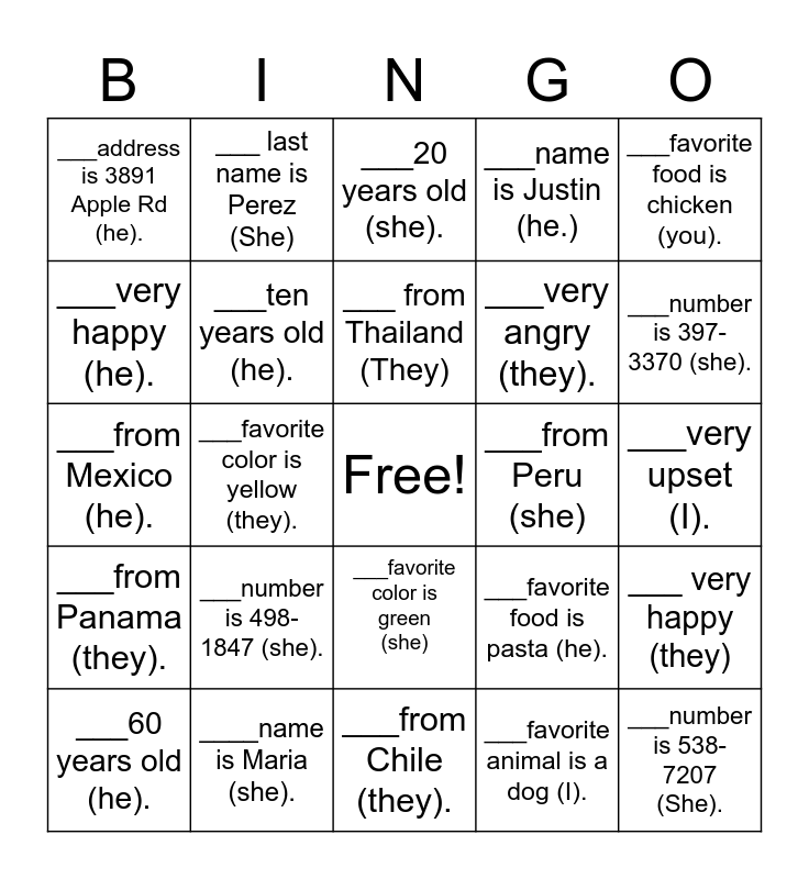 This bingo card has a free space and 24 words: ___number is 498-1847 (she)., ____name is Maria (she)., ___ from Thailand (They), ___60 years old (he)., ___favorite food is chicken (you)., ___address is 3891 Apple Rd (he)., ___very happy (he)., ___ last name is Perez (She), ___from Peru (she), ___favorite color is green (she), ___very angry (they)., ___from Mexico (he)., ___favorite food is pasta (he)., ___ very happy (they), ___ten years old (he)., ___favorite animal is a dog (I)., ___very upset (I)., ___20 years old (she)., ___number is 397-3370 (she)., ___favorite color is yellow (they)., ___number is 538-7207 (She)., ___from Panama (they)., ___name is Justin (he.) and ___from Chile (they)..