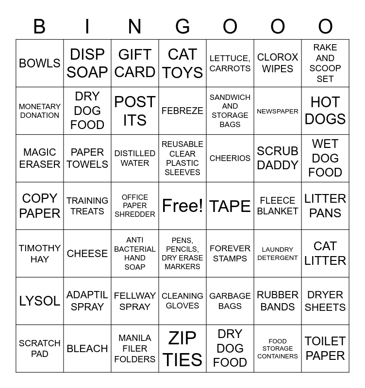 This bingo card has a free space and 55 words: DRY DOG FOOD, WET DOG FOOD, DOG TOYS, BOWLS, TRAINING TREATS, ADAPTIL SPRAY, RAKE AND SCOOP SET, WET CAT FOOD, DRY DOG FOOD, FELLWAY SPRAY, CAT TOYS, CAT LITTER, LITTER PANS, FLEECE BLANKET, SCRATCH PAD, TIMOTHY HAY, LETTUCE, CARROTS, SANDWICH AND STORAGE BAGS, FOOD STORAGE CONTAINERS, NEWSPAPER, HOT DOGS, CHEESE, CHEERIOS, GIFT CARD, BATTERIES, MONETARY DONATION, OFFICE PAPER SHREDDER, BRILLO PAD, MAGIC ERASER, SCRUB DADDY, WINDEX, LAUNDRY DETERGENT, DRYER SHEETS, BLEACH, CLOROX WIPES, FEBREZE, LYSOL, PAPER TOWELS, TOILET PAPER, ANTI BACTERIAL HAND SOAP, DISP SOAP, CLEANING GLOVES, GARBAGE BAGS, DISH CLOTHS, DISTILLED WATER, COPY PAPER, MANILA FILER FOLDERS, FOREVER STAMPS, TAPE, POST ITS, PENS, PENCILS, DRY ERASE MARKERS, RUBBER BANDS, ZIP TIES, REUSABLE CLEAR PLASTIC SLEEVES and KLEENEX.