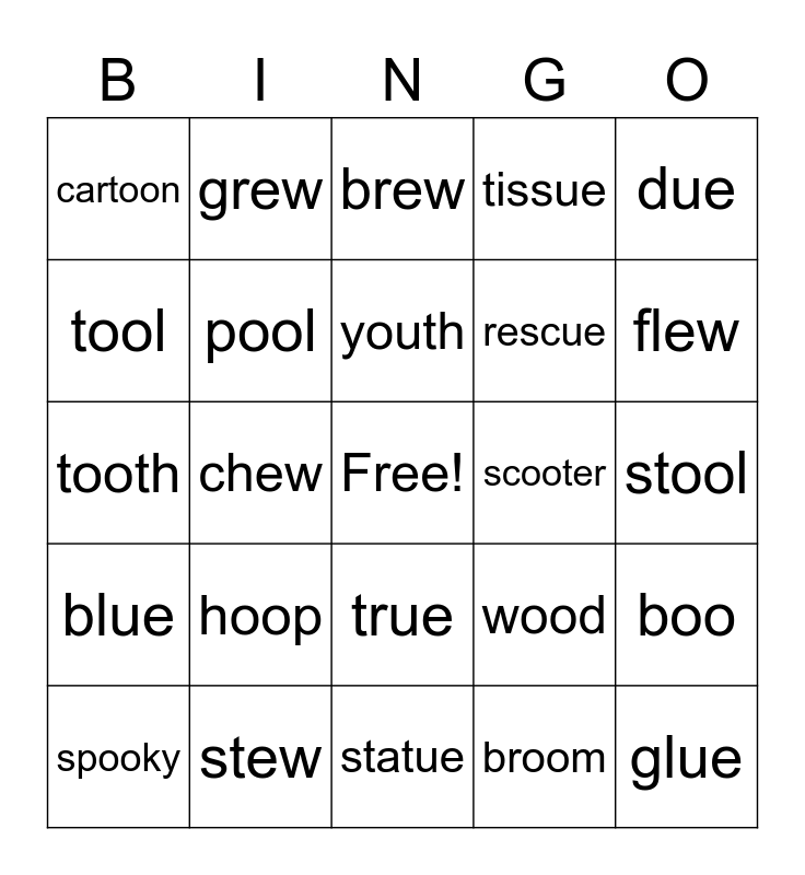 This bingo card has a free space and 24 words: hoop, stew, youth, spooky, due, cartoon, tool, grew, scooter, true, rescue, tooth, wood, boo, pool, broom, stool, brew, flew, chew, glue, blue, tissue and statue.
