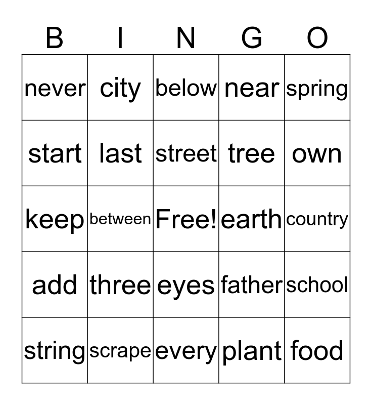 This bingo card has a free space and 24 words: three, scrape, street, string, spring, never, start, city, earth, eyes, tree, keep, father, school, last, plant, country, below, own, between, food, add, near and every.