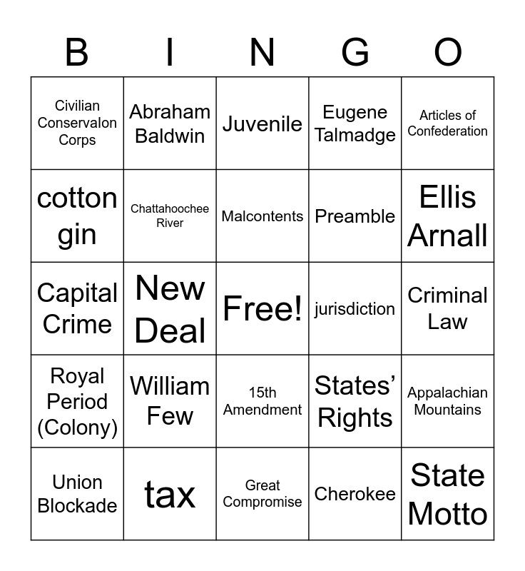 This bingo card has a free space and 226 words: 13th Amendment, 14th Amendment, 15th Amendment, 1946 Governor Controversy, 1956 State Flag, 1996 Olympics, 3⁄5Compromise, 5 Capitals of GA, abolish, Abraham Baldwin, Abraham Lincoln, Administer JusIce, Agricultural Adjustment Act, agriculture, amendment, Albany Movement, Alexander Stephens, Alonzo Herndon, Amendment, American RevoluIon, Anaconda Plan, Andersonville, Andrew Jackson, Andrew Young, Appalachian Mountains, Appellate Court, Archaic, Article, Articles of Confederation, Atlanta Campaign, Atlanta Race Riot, Barrier Islands, Battle of Chickamauga, Battle of Kettle Creek, Bell Bomber, bicameral, Bicameral Legislature, Bill of Rights, Black Legislators during Reconstruction, Boll Weevil, Booker T. Washington, Bourbon Triumvirate, Brown v. Board of Education, Budget, Button Gwinnett, Capital Crime, Carl Vinson, Charlayne Hunter, Charter of 1732, Cherokee, Civil Rights Movement, Civil War, Charter of 1732, Chattahoochee River, Checks and Balances, Civil Law, Civil Rights Act, Civilian ConservaIon Corps, confederation, Constitutional Convention, cotton gin, credit, Creek (Muscogee), Committee, Compromise of 1850, Congressional Reconstruction, Constitution, Criminal Law, Dahlonega Gold Rush, Debt, Declaration of Independence, Deepwater Ports, delinquent behavior, discrimination, Disenfranchisement, Dred Scott, Drought, ElecIon of 1860, Ellis Arnall, EmancipaIon ProclamaIon, Entrepreneur, Eugene Talmadge, Executive, Fall Line, Felony, Film Industry, Franklin D. Roosevelt, Freedman’s Bureau, French and Indian War, GA’s Continent, GA’s Country, GA’s Hemisphere, General Assembly, General Sherman, George Walton, governor, Great Compromise, Great Depression, Grandfather Clause, Great Compromise, Great Migration, Hamilton Holmes, Hartsfield Jackson InternaIonal Airport, Headright System, Henry Grady, Herman Talmadge, Hernando DeSoto, Highland Scots, Income, Indian mound, indigo, Integration, InternaIonal Cotton Expo, Interpret Laws, Interstate, Invest, Ivan Allen, Jr., James Oglethorpe, Jews, Jim Crow Laws, Jimmy Carter, jurisdiction, John Lewis, John Marshall, John Ross, Judicial, Jury, Juvenile, Ku Klux Klan, land lottery, LegislaIve, Lend-Lease Act, Leo Frank, Lester Maddox, Literacy Test, Loyalist, Lusitania, Lyman Hall, Malcontents, March on Washington, Martin Luther King, Jr., Mary Musgrove, Maynard Jackson, mayor, Melvin Thompson, Mercantilism, Misdemeanor, Mississippian, Missouri Compromise, Nancy Hart, New Deal, New South, nomad, Nullification, Okefenokee Swamp, Overproduction, Paleo, patriot, Pearl Harbor, Philanthropy, Economics, Defense, Plessy v. Ferguson, political, Poll Tax, Populist Party, Preamble, ProclamaIon of 1763, Railroads, ratify, Reconstruction, ResponsibiliIes of Citizens, Richard Russell, Royal Governor, Royal Period (Colony), Rural ElectrificaIon Act, rural, Salzburgers, Savannah & Brunswick Shipyards, Savannah River, Savannah, Saving, Secede/secession, segregation, Separate but Equal, SeparaIon of Powers, Sequoyah, sharecropping, Sibley Commission, Siege of Savannah, Slavery, smallpox, sovereignty, Social Security Act, Southern Christian Leadership Conference, Spanish Missions, Special Purpose District, State Motto, States’ Rights, Student Non-Violent CoordinaIng Committee, tariff, tax, Tom Watson, Tomochichi, Tourism, Trail of Tears, treaty, Trial Court, Trustee Period, Trustees, Union Blockade, University of Georgia, Unruly, VoIng Qualifications, W.E.B. DuBois, W.R.I.S.T. Crops, Warm Springs/Little White House, Wattle and Daub, White Primary, William B. Hartsfield, William Few, William McIntosh, Woodland, Worcester vs Georgia, World War I, World War II, Yazoo Land Fraud and Zimmerman Telegram.