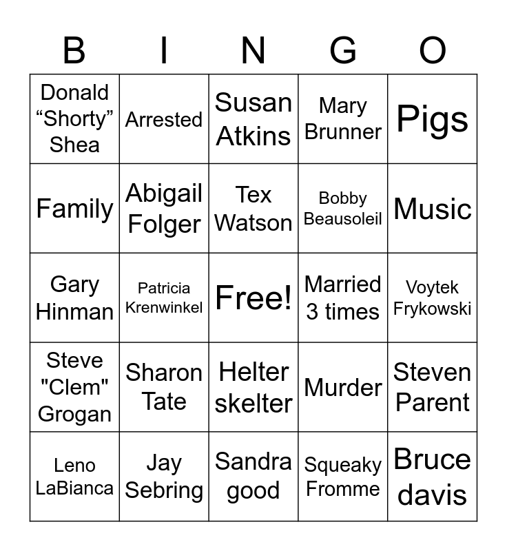 This bingo card has a free space and 24 words: Sharon Tate, Jay Sebring, Tex Watson, Leno LaBianca, Pigs, Donald “Shorty” Shea, Family, Arrested, Married 3 times, Helter skelter, Bobby Beausoleil, Gary Hinman, Murder, Steven Parent, Abigail Folger, Squeaky Fromme, Voytek Frykowski, Susan Atkins, Music, Patricia Krenwinkel, Bruce davis, Steve "Clem" Grogan, Mary Brunner and Sandra good.