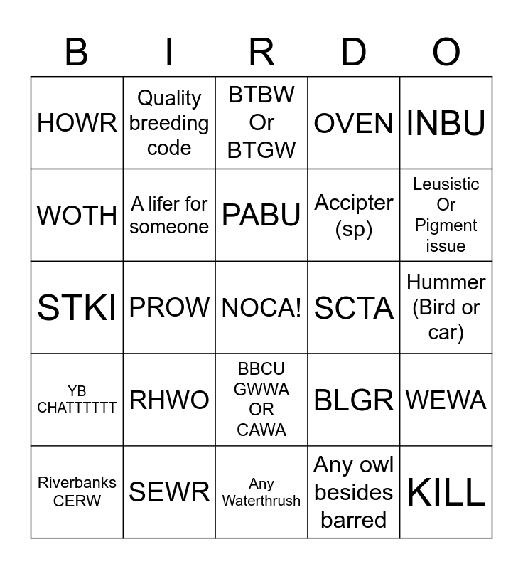 This bingo card has a free space and 24 words: RHWO, SEWR, PABU, Riverbanks CERW, INBU, HOWR, WOTH, Quality breeding code, SCTA, BBCU GWWA OR CAWA, Accipter (sp), STKI, BLGR, WEWA, A lifer for someone, Any owl besides barred, Hummer (Bird or car), BTBW Or BTGW, Leusistic Or Pigment issue, PROW, KILL, YB CHATTTTTT, OVEN and Any Waterthrush.